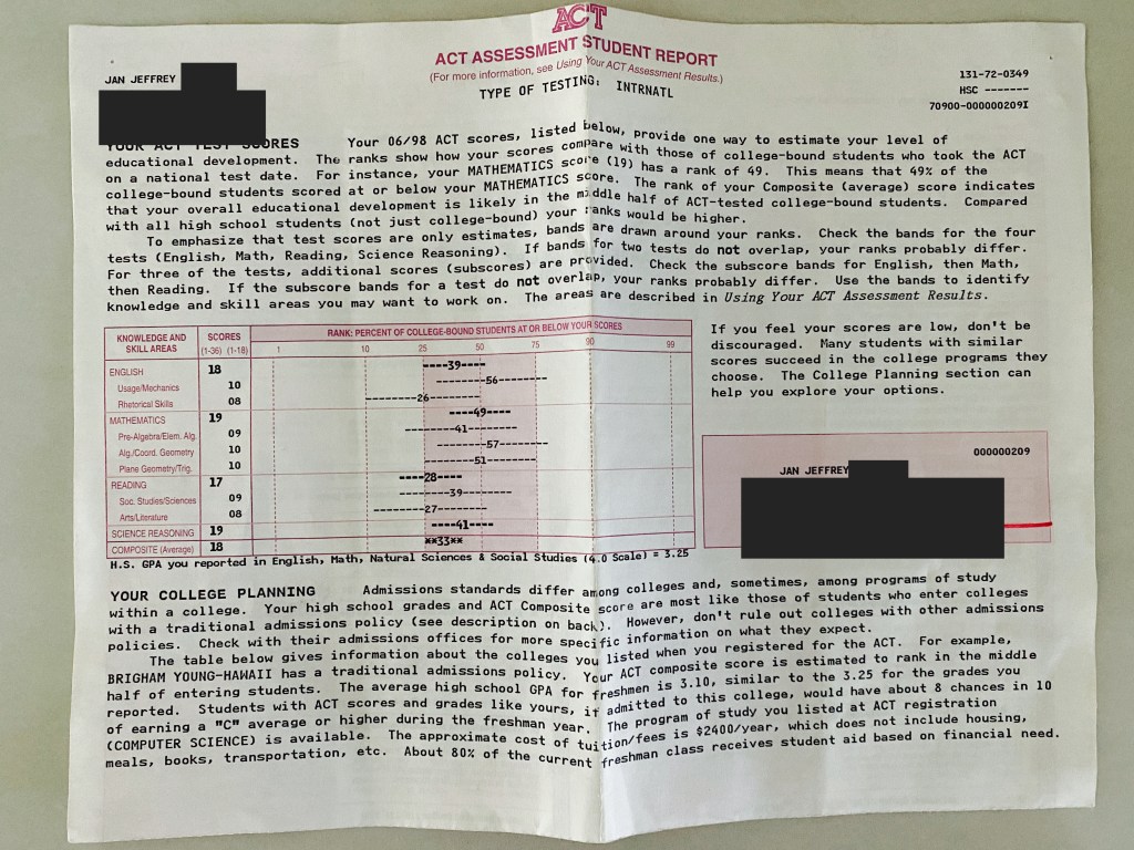 The above photo is my ACT(American College Test) test results. According to princetonreview.com “The ACT is scored on a scale of 1–36, and the average ACT score for the class of 2017 is 21”. I scored an 18. It was not a good score. This score was representative of my grades up until high school. I did not have great grades.