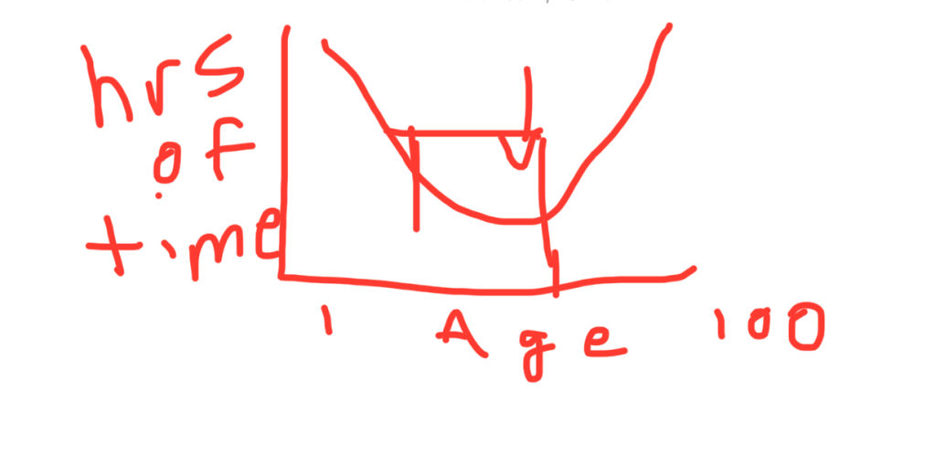 We are born into this world and are highly dependent on our parents. At age 5 we begin kindergarten and progress through school, moving from elementary school all the way through high school. Age 18 can be a pivotal time deciding whether you go to college or begin working. College and continued education will add at least 4 more years, but all paths eventually lead to the workforce. Work lasts for a long time. There’s no way around it. Somewhere around this time you may get married and start having kids. This also lasts for a long time and requires huge amounts of your time. On top of this there are volunteer responsibilities at church and in the community. During this time, say starting at age 35, you have the least amount of free time for yourself. Your free time has gone from abundant and gradually decreased. The good news is is that it will hit its lowest during this phase and gradually start going back up. Kids will become independent, graduate from high school, go onto college and find a job. You will retire from work and hopefully have saved up enough money to enjoy retirement. You will become empty nesters. Free time now is increasing and becoming quite abundant. You have arrived back to where you started.